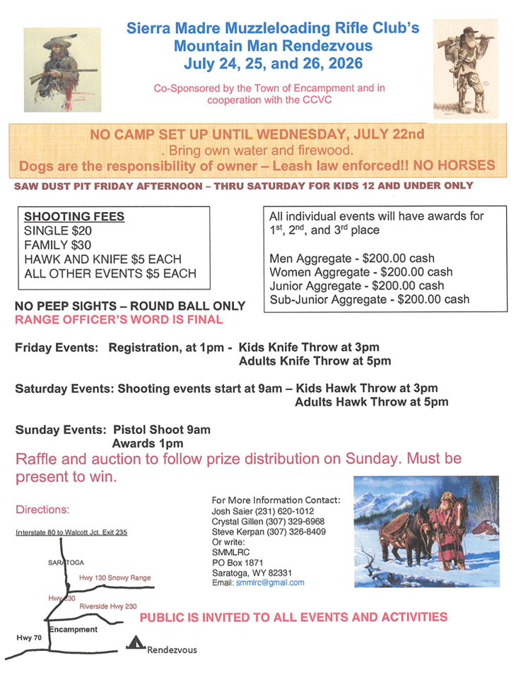 Sealed bids must be received no later than 2:00 p.m. Wednesday May 6, 2026 by mail or hand delivered in a sealed package clearly labeled “McClure Field Fence Replacement Project.” to: Town of Encampment, PO Box 5, Encampment WY 82325.